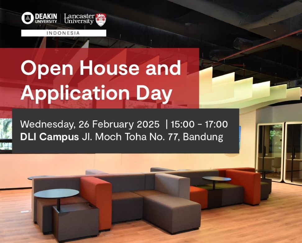 Join us for our Open House and Application Day on Wednesday, 26 February 2025, at Deakin University Lancaster University Indonesia Campus, located at Jalan Moch Toha 77. Our friendly team will assist you and provide more information about the courses and scholarships.