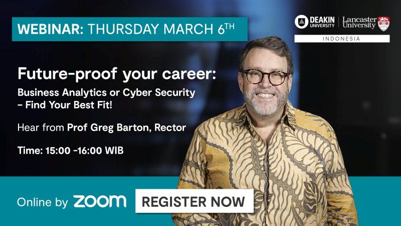 Deakin University Lancaster University Indonesia provides a webinar with the theme “Future-Proof Your Career: Business Analytics or Cyber Security – Find Your Best Fit!”. You can hear from our faculty and the staff members.