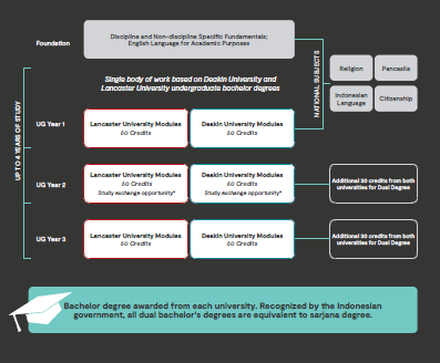 Our dual degree programs combine modules from a Lancaster University bachelor’s degree and a Deakin University bachelor’s degree. Upon completion, students will earn two separate qualifications—one from each university.